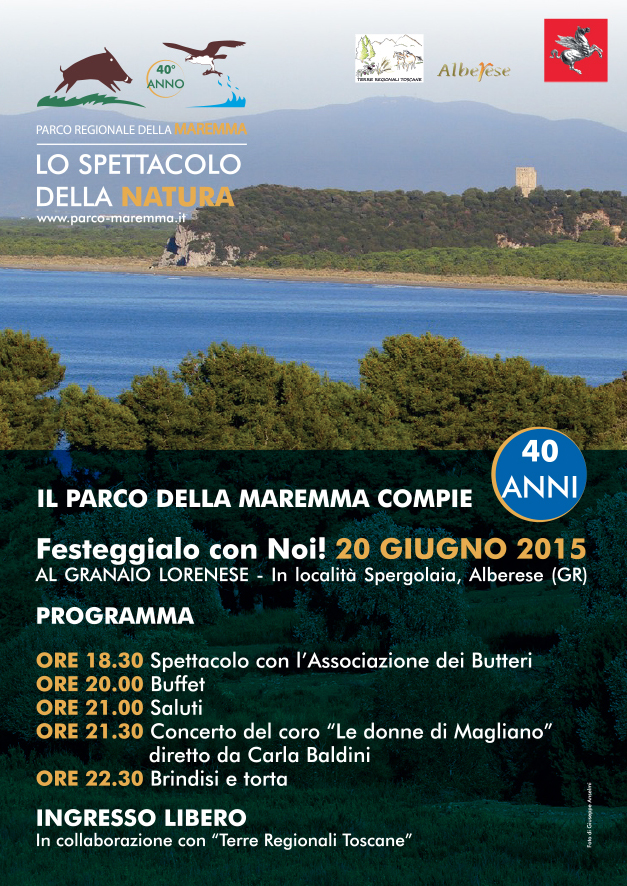 Il Parco Regionale della Maremma sarà festeggiato con un ricevimento, a cui è invitata tutta la comunità, il 20 giugno 2015, a partire dalle 18.00, presso il granaio lorenese, in collaborazione con “Terre Regionali Toscane”.