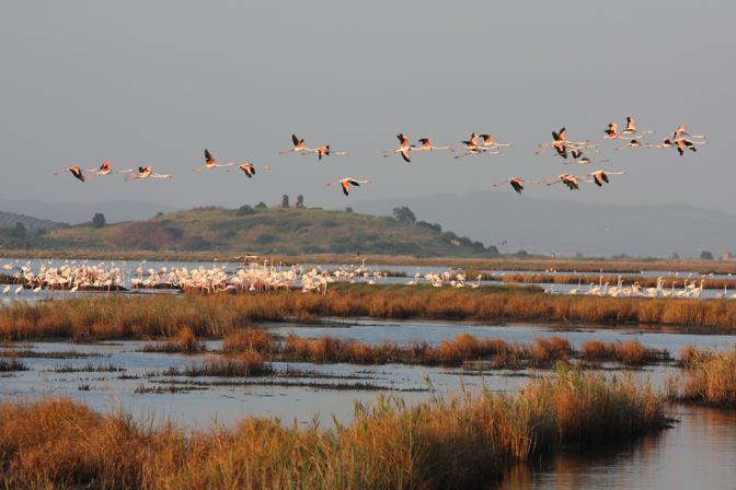 Sulla costa l’area protetta più importante è naturalmente il parco dell’Uccellina. Esistono numerose e vaste zone umide, dove sono presenti numerosi contingenti di uccelli acquatici. Sono naturalmente inserite all’interno di riserve naturali. Scendendo più a sud incontriamo quindi la Laguna di Orbetello. Si trova proprio lungo una importante rotta migratoria, e rappresenta un importante sito di svernamento per numerose pecie acquatiche del mediterraneo. Qui possono essere osservati il fenicottero, il piviere dorato, la gru, la spatola, l’oca